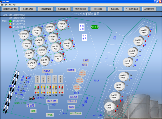 本畫面主要是對油庫整個系統的平面監視圖,對各個油罐及發油臺的狀態的顯示。
